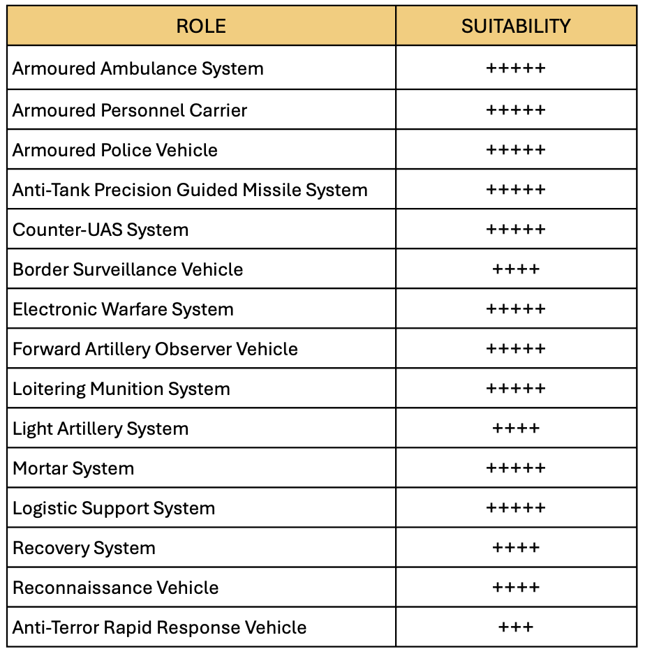 Thanks to its modular design and robust protection concept, the MINK vehicle platform can be configured for a broad spectrum of mission profiles. From an Armored Personnel Carrier and Reconnaissance Vehicle to specialized Forward Artillery Observer Vehicle, the system offers a high degree of adaptability for military, special forces and other law enforcement units.