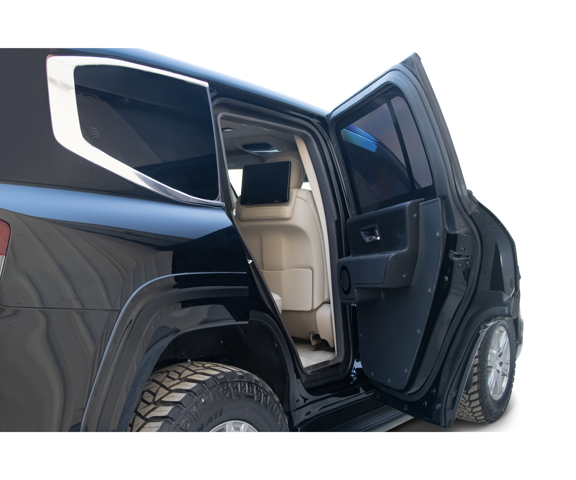 FULL OVERLAP ARMOUR – around all door apertures with splash guards to prevent penetrations into the cabin from direct and angled strikes or ricochet. Design enhances blast protection.